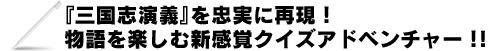 なんと収録シナリオは「魏」10本、「呉」7本、「蜀」11本の計28本。書籍にしたら11冊分のボリューム。「魏」・「呉」・「蜀」それぞれの物語を楽しみながら三国志の知識が身につく、まさに一石二鳥の1枚。メインモードの「ストーリーモード」で、全150ステージのストーリーを追いつつクイズを楽しめば、いつの間にか物語に入り込んでいるはず!