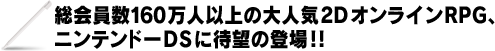 総会員160万人以上の大人気2D-オンラインRPG。最大の特徴は、1キャラクターで2つの職業を楽しめる「変身システム」と、自分だけのアイテムを作ることができる「称号システム」。
