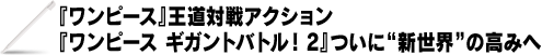 たくさん登場する『ワンピース』キャラクターから自分の好きな海賊団を作ってバトルする対戦アクションゲームの新作。新エピソード“新世界編”の麦わら一味を含めて100キャラ登場します。