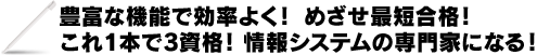 IT社会で生き抜く実用的な能力の証明になる「ITパスポート」「基本情報技術者」「応用情報技術者」の過去10年分の問題と詳しい解説を収録した、本格的国家資格学習ソフトです。試験に合格するためのさまざまなコンテンツで学習することができます。