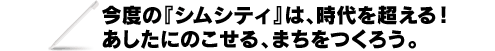 『シムシティ』とは、プレイヤーが市長となり、住民の願いを聞きながら、いろいろな建物を建てたり、畑や工場をつくったりして、まちを発展させ、人工を増やしていく都市育成シミュレーションゲームです。