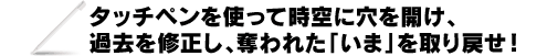 ◆“新感覚”謎解きシステム 過去に戻るのではなく「時空へ穴を掘り、過去を修正し、違う現在に変える」という、タッチペンを使った“新感覚”の謎解きシステムを搭載。