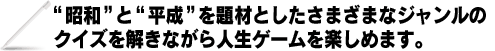 ご存知!『人生ゲーム』がクイズ&ボードゲームとしてDSで登場!人生ゲームシリーズの中で特に人気の高い、クイズイベントでまるごと作ったこのゲーム。『人生ゲーム Q DS 昭和のデキゴト』では懐かしの昭和を、『人生ゲーム Q DS 平成のデキゴト』では平成元年からのスポーツ、テレビ・映画、音楽、文学・歴史、マンガ・アニメ、社会、遊びとさまざまなジャンルのクイズを解きながら、人生ゲームを楽しめます。ルーレットを回して数々のイベントをこなしながら、昭和や平成の街並みを再現したマップを駆け巡りゴールを目指す“すごろくタイプ”です。