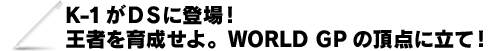 新設ジムのオーナー(会長)となり、K-1の頂点を目指してファイターの育成をおこなうシミュレーションゲーム。さまざまなトレーニングや試合出場、人材発掘を行い、「K-1 WORLD GP」での優勝、そして各階級のチャンピオンを目指そう!
