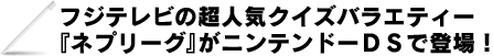 「ファイブリーグ」、「ファイブツアーズ」、「ファイブボンバー」、「トロッコアドベンチャー」といったおなじみのクイズが、タッチペン入力によって番組の雰囲気そのままに楽しめる!そして収録問題数はなんと1万問!一般常識といえる問題からめったにお目にかからないような漢字など、さまざまな出題形式の問題を用意。ひょっとしたら『ネプリーグDS』で遊んでいるうちにさまざまな知識が身についちゃうかも!?ゲーム中のキャラクターには大人気お笑いトリオ「ネプチューン(名倉潤さん、原田泰造さん、堀内健さん)」が登場。また、ナレーションはフジテレビ「伊藤利尋アナ」が担当!ニンテンドーDSを通じて、あなたも番組の解答者になって楽しめます。