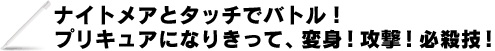 変身・必殺技が簡単タッチペンアクションでできちゃう!さらに、ゲーム中もプリキュア達は力をあわせて戦うよ!「れんけい」攻撃でナイトメアに強力アタック!