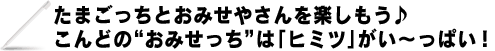 こんどの“おみせっち”の舞台は「プッチが丘」!『みなサンきゅ〜!』を持っている子同士でツーしんすると、お友達が、なんと今作オリジナルたまごっちの姿になって、パークやおみせに登場するよ!占いや交換日記が楽しめたりと、たまごっちのキャラクターたちや、お友達と一緒に遊べる要素が盛り沢山♪