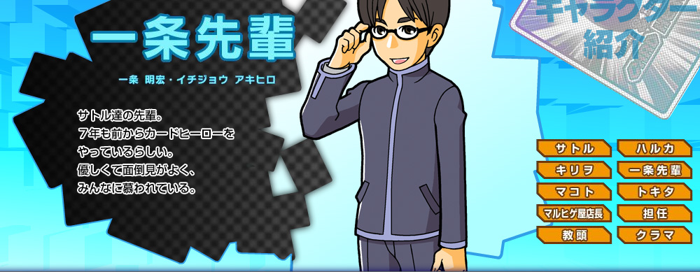 一条 明宏・イチジョウ アキヒロサトル達の先輩。7年も前からカードヒーローをやっているらしい。優しくて面倒見がよく、みんなに慕われている。