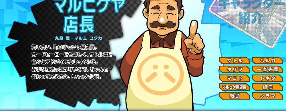 丸見 豊・マルミ ユタカ気の良い、町のオモチャ屋店長。カードヒーローにも詳しく、サトル達に色々とアドバイスをしてくれる。あまり商売っ気がないので、ちゃんと儲かっているのか、ちょっと心配。