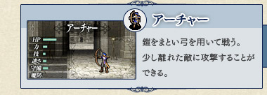 アーチャー 鎧をまとい弓を用いて戦う。 少し離れた敵に攻撃することができる。 |