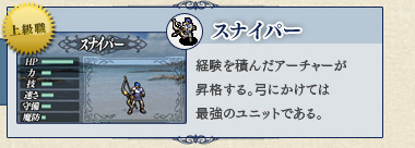 スナイパー 経験を積んだアーチャーが昇格する。 弓にかけては最強のユニットである。 |