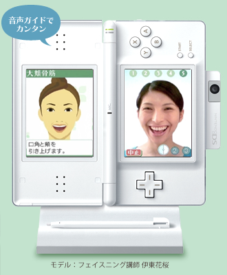 発売日:2007年8月2日発売 希望小売価格:4,571円(税別) ジャンル:表情筋トレーニング プレイ人数:1人 ※セーブデータは1つです。 ※このソフトはニンテンドーDSiでは使用できません。●顔認識カートリッジ  「フェイスニングスキャン」付属 ●ニンテンドーDSシリーズ専用スタンド付属