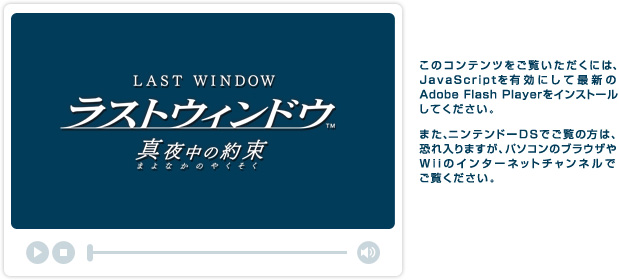 ラストウィンドウ 真夜中の約束 このコンテンツをご覧いただくには、Javascriptを有効にして最新のAdobe Flash Playerをインストールしてください。また、ニンテンドーDSでご覧の方は恐れ入りますが、パソコンのブラウザやWiiのインターネットチャンネルでご覧ください。