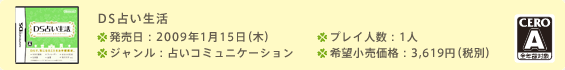 DS占い生活 発売日:2009年1月15日(木) プレイ人数:1人 ジャンル:占いコミュニケーション 希望小売価格:3,619円(税別) CERO A 全年齢対象