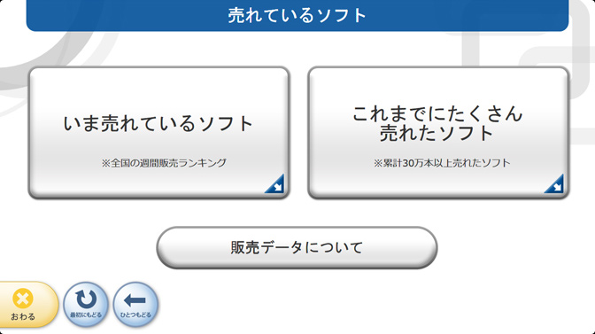 発売日から現在までの累計販売本数30万本以上のソフト一覧と、直近1週間の週間販売ランキングトップ10が表示されます。全国の売れ筋ソフトが一目でわかるようになっています。