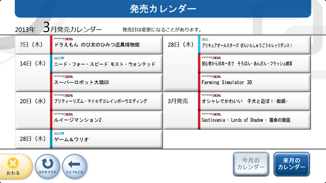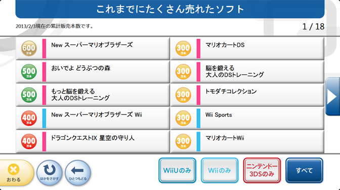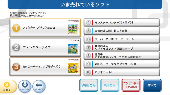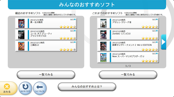 Wii U、ニンテンドー3DSの『ニンテンドーeショップ』でいただいたお客様からの「おすすめ投票」をもとに算出した、Wii Uと3DSのおすすめソフトが表示されます。