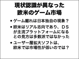 日本と欧米ではゲーム市場環境が大きく異なっており、我々が、DSを発売した2年前には、現状認識が異なっていたように思います。例えば、ゲーム市場の縮小が起こっていなかった欧米では、ゲーム離れは日本独自の現象であるとの見方がありましたし、欧米はリアル志向なので、DSのようなアイディア重視のプラットフォームが主流になるとの見方は決して多数派ではありませんでした。そして、nintendogsや脳を鍛えるソフトなどのユーザー拡大ソフトは、欧米では市場性が低いという認識が一般的だったと思います。 |