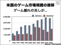 しかし、驚異的な成長を続けてきた北米のゲーム市場も、昨年ついにソフト市場が前年割れとなり、大手のパブリッシャーの収益が悪化するという状況が起こるに至って、「ゲーム離れが日本独自という認識はどうやら誤りである」ということが、業界の人々の共通認識になってきました。 |