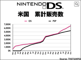 このグラフは、TRSTSによる、DSとPSPの累計普及台数です。夏にDS Liteが発売されて以降、DSのユーザー拡大戦略によるソフトの展開とも相乗効果を発揮して、DSが伸び始めました。 |