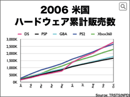 また足下のデータとして、このグラフには掲載されていませんが、感謝祭の週にDSは約42万台が売れました。発売されたばかりのWiiを除き、PS2やXbox360などの据置型ゲーム機と比べてもずっと多い量が売れたことになるのですが、これは、昨年同時期の倍以上の数であり、今年はDSが最も数を売るハードウェアになることは間違いないと言えそうです。 |