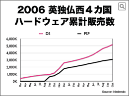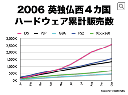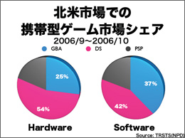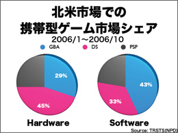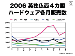 また北米では、ゲームボーイアドバンスからDSへの移行が世界で最も遅れていたのですが、今年の夏以降、ようやく状況が変わってきました。DS Lite発売以降、ハードでは既にDSが最も売れる商品になっていたのですが、ソフトはゲームボーイアドバンスの巨大な普及台数のために、まだDSソフトがなかなかメインストリームになりませんでした。 |