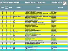 これは、先々週のフランスのゲームのヒットチャートで、GfKという調査会社のデータです。黄色はDSのソフトなのですが、トップ10のうち6本、トップ20のうち14本がDSソフトです。まぎれもなく、日本と同じように、DSが市場のメインストリームになりつつあることを実感しています。 |