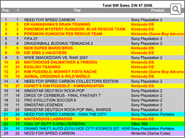 これは、先々週のドイツのゲームのヒットチャートです。やはり外部の調査会社のデータです。同じく黄色はDSのソフトなのですが、トップ10のうち5本、トップ15のうち8本がDSソフトです。DSのソフトは、この週、今までで最高の売り上げになりました。また、2位の脳トレソフトは発売から5ヶ月以上経過しての数字です。 |