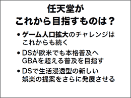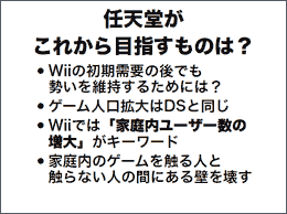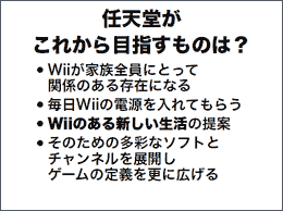 さて、足下の話はこれくらいにして、最後に、これから我々が目指すものについてお話ししたいと思います。任天堂のゲーム人口拡大戦略が、今日のように市場で受け入れられたことは、私たち自身の予想さえも超えるものですが、では、Wiiを発売した今、次に何を目指すのかということです。 |