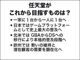 そのことが、最終的には、DSを一家に1台から一人に1台への普及に近づけることにつながり、私たちは、これにチャレンジしていくことになります。今でも、一家に複数台のDSを所有していただいていることは決して珍しくないのですが、本当に一人一人が持つ意味を作り出さない限り、この流れはできないと思います。そして、年末までには1400万台を超える見込みで普及ペースの記録を更新し続けている日本では、ゲームプラットフォームとして史上最大の普及を目指していきます。北米ではゲームボーイアドバンスからDSへの移行がこれから本格化するため、アドバンスからのシフトを積極的にサポートし、市場のスケールにあわせた本格的普及段階へ移行させることを目指します。欧州は、日本で今年経験した爆発的普及に近い水準に到達していますので、如何にその勢いを維持して、本当に幅広い潜在顧客の需要を顕在化できるかどうかが、雪崩をうって市場の破壊的変革を実現できるかどうかの鍵になります。 |