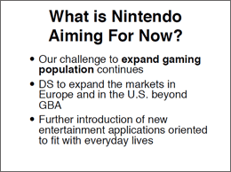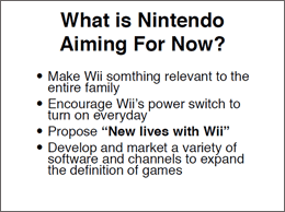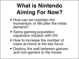 So that's the current situation and, finally, I would like to discuss what we are aiming at now. Our gaming population expansion strategy has been working more than we could expect. Now that we have launched Wii, what will we try to achieve? |