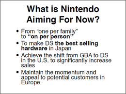 Doing so will accelerate the sales of DS from "one DS per family" to come close to "one DS per person". This is our challenge. Even today, it is not uncommon to see multiple DS units played in one household. However, we will need to create a need for each individual to own DS in order to set an even stronger sales trend. In Japan where DS has been revising sales records, the cumulative sell-through is expected to top 14 million by the end of this year, we are aiming to make DS the biggest selling hardware in the history of video games. In North America, we are expecting the significant shift from GBA to DS to take place soon. Accordingly, we will proactively support the shift from GBA and will promote DS to largely sell in the U.S., the area which has the biggest market potential. Europe is coming closer to the explosive sales that we have experienced in Japan. How we will be able to maintain the momentum and encourage a large number of potential customers to purchase DS will become the cause of the avalanche-like disruptive changes in the market. |