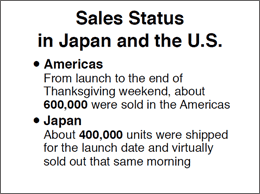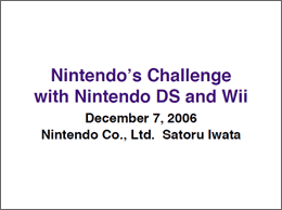 These are pictures from the Japan launch. A number of customers gathered the night before. At this Yodobashi Camera Umeda store in Osaka the shop prepared 2800 Wii hardware but, because more people gathered than the shop expected, they had to declare the complete sell-out in early morning, even before the early morning store opening. So, we were able to successfully launch Wii, and the people in the U.S. and Japan were eager to purchase Wii. As I showed you today, Wii is significantly different from any past video game machines. I would like to spend some time to explain how this unique console was born. |