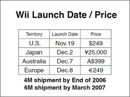 Wii launch dates and prices in each region are as you can see on the slide. We launched Wii in the U.S. first, before Thanksgiving Day. We launched Wii in Japan only last week. Today is the Australian launch day, and Europe will be tomorrow. Nintendo aims to ship 4 million Wii hardware by the end of this calendar year and 6 million by the end of this fiscal year in March. |