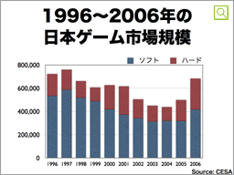これは、業界団体のCESAの統計による、各暦年の日本のゲーム市場規模の推移ですが、長い間成長が見られなかった日本のゲームソフト市場は、 DSに数多くのヒットソフトが生まれたことで、 2006年にほぼ10年ぶりに大きく成長しました。