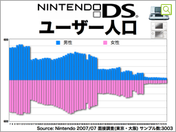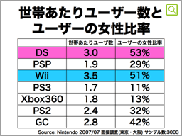 もう1つ、これらの調査を通じて、ゲーム機のハードごとの、世帯あたりのゲーム機を触っていただいているお客様の数、「世帯あたりユーザー数」を調べています。ここにも、DSやWiiの独自性がはっきりと表れています。 かつて、据置型ゲームで2.2〜2.8程度、携帯型ゲーム機では2.0前後だった世帯あたりのユーザー数は、Wiiでは3.5、DSでは3.0と、史上最も高いものになっています。この調査には一人暮らしの方の世帯も多く含まれていますので、家族全員がDSやWiiを遊んでいただく世帯がいかに多いかということを同時に表しているデータでもあります。 そしてこれは、お客様の中の女性比率が高いことと大きな相関があります。任天堂のプラットフォームが、幅広い年齢層の女性のお客様のご支持をいただいたことは、ゲーム人口を拡大し、市場の活性化をもたらした大きな力になっています。