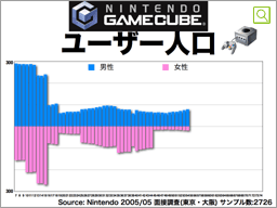 一方、据置型のハードですが、これは2年半前の調査のゲームキューブのお客様の年齢や性別の構成です。縦軸のスケールは先ほどと少し変えてあります。やはり、この時のお客様の構成は、低年齢層に厚みがある構成でした。このようなことから、ゲームキューブやゲームボーイアドバンスの時代には、任天堂のプラットフォームは子供向けという認識が一般的でした。