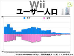 これに対して、今年7月時点でのWiiのお客様の構成は、このようになっていました。この時点での普及台数は、まだ300万台程度と普及の初期段階ですが、既に幅広い年齢の大人層にはゲームキューブ以上に受け入れていただいており、必ずしも低年齢層中心の構成にはなっておりません。また、DSに引き続き、女性比率が51%と、過半数を超えています。