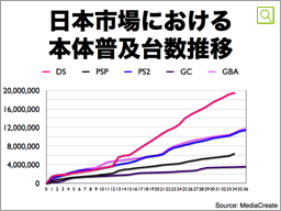 これは、各プラットフォームの発売以来の販売推移を表したものですが、ご覧のように、DSは2年目から、過去に普及したプラットフォームの年末商戦期並みのペースで、ほとんど季節性の感じられない史上最速の圧倒的な普及ペースで販売が続いてきました。 この要因を、ユーザー人口という観点から捉えますと、お客様が低年齢層中心から幅広い年齢の方に年齢構成が変わったことで、DSを買いたいと考えていただいたお客様が、家族の誰かに頼んで、年末年始や春夏の休みの時期など、いわゆる商戦期に買ってもらうプレゼント需要中心だったものが、欲しいと思った大人のお客様が自分のために買うという需要に変わったこと、そして、世帯あたりのユーザー数が増え、家庭の中でも多くの方が、自分に関係があるものとして捉えてくださる、別の言い方をすれば、ゲーム機を購入する際に家庭の中で反対する方が少なくなる、という2つのことが、この変化をもたらしたのではないかと考えています。