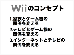 昨年お話ししましたとおり、私達は、Wiiを開発するにあたって3つの開発コンセプトを設定しましたが、家族とゲーム機の関係を変えることについては、家庭内ユーザーの数が増えていることで、一定の成果を上げていると考えています。また、テレビとゲーム機の関係を変えることについては、先ほどお話しした調査の中で、Wiiのリビングルームへの設置率が83%に達していることなどで、一定の手応えを得ています。 問題は、最後のインターネットとテレビの関係についてです。