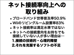 日本の家庭へのブロードバンド世帯普及率は既に50.9%に達しています。また、先ほどお話ししたとおり、Wiiは83%の方が家庭内のリビングに置いていただいています。しかし、日本でのネットへの接続率はブロードバンド世帯普及率より低く、まだ不十分と言わざるを得ません。 そして、ネットへの接続意向をお持ちでも、繋いでいない人が多くおられることもわかっているのですが、その理由は、ネットに接続するという行為に対する技術的・心理的な障壁が高く簡単には乗り越えられないこと、そして、それを克服するためのソフトの提案がまだ十分ではないことの2つであると考えています。