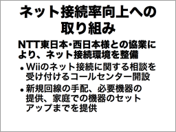 Wiiへのネット接続を推進するためには、さまざまな対応ソフト群の準備はもちろんですが、それだけではなく、ネット接続環境を整備して、お客様の心理的・技術的な障壁を乗り越えるお手伝いをしていく必要があると私達は考えています。 このたび、日本国内では、NTT東日本様、NTT西日本様、両社との協業により、ネット接続環境を整備することに取り組んでいきます。具体的には、Wiiのネット接続に関するご相談をワンストップで受け付け、ネット接続に伴うお客様の心理的・技術的な障壁を乗り越えるお手伝いをするコールセンターを開設して、共同で運営すること。そして、接続環境をお持ちでないお客様に対して、お客様のコスト負担を極力抑えた価格で、新規回線の手配、必要機器の提供、そして家庭での機器のセットアップまでのフルサポートを提供することの2点から始める予定です。近日中に、より詳しい内容について、お知らせできると思います。