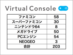 昨年、Wiiの本体を発売した時に始めたバーチャルコンソールのサービスですが、順次選択していただけるソフトが増え、本日現在で、合計203タイトルになりました。