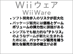 家庭用ゲーム機の市場が誕生し、まもなく四半世紀が経過しようとしていますが、当初は誰もが小さいリスクで参入できたゲームソフト開発は時代と共に大きく変わり、今では優れたアイディアがあっても、巨大化したリスクを負うことができずに形にならないという状況が増えています。 パッケージ販売がこれからもこの業界の重要な販売方法であることは間違いありませんが、その一方でその価格付けの弾力性には限界があり、そのためゲームボリュームの弾力性を十分に持つこともできません。本来はゲームボリュームだけがソフトの価値ではないはずですが、お金を出して購入するお客様の立場で考えれば、パッケージソフトなりのボリュームを自然と求めてしまうこともまた事実です。このような環境では、『テトリス』のようなシンプルで多くのお客様に愛されるソフトが新たに世に出るチャンスがほとんどなくなってしまいます。 Wiiウェアは、パッケージソフトを補う新たな販売方法の確立が必要であるという考えで準備を進めてきたものです。