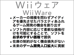 Wiiウェアは、メーカーの規模に関わらず「アイディア」を優先させたバラエティあふれるゲーム開発の機会を作り出すと共に、ソフトの内容に応じて柔軟な価格付けを可能にすることで、ソフトをお求めやすい価格でお客様に提供するための新しい試みです。また、在庫の制約がなく、在庫切れによる機会損失もありません。既にバーチャルコンソールが同様の仕組みで実績を上げており、お客様も店頭でWiiポイントプリペイドカードを購入して、自宅でソフトをダウンロードすることに徐々に慣れてこられています。私はゲーム開発者出身ですが、ここでアイディア勝負の土俵を用意することは、未来のゲーム開発人口の拡大にとっても、大きな意味を持つと考えています。 ダウンロードしたソフトは、バーチャルコンソールと同様に、Wii本体の内蔵メモリに格納され、Wiiメニュー上からチャンネルの1つとして起動できます。