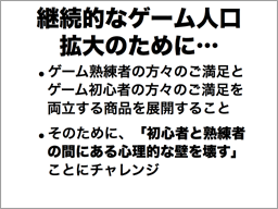 継続的なゲーム人口の拡大のために、私達が重要だと考えていることがもう1つあります。 それは、ゲーム熟練者の方々にご満足いただくだけではなく、ゲーム初心者の方にもご満足いただけるような商品を展開していくことです。この2つが両立しなければ、ゲーム機を日常的に触っていただくお客様の数は継続して増えていくことはあり得ません。これまでのゲーム業界の常識としては、「この商品は初心者向けだ」、「こっちの商品は上級者・熟練者向けだ」と、商品ごとにどんどん商品を細分化してソフトラインナップを揃えていくというのが一般的なアプローチでした。このような方向で成熟が進むとお客様がどんどん細かく分断されて、その結果、対象も狭まり、そしてゲームを楽しむお客様の数が減っていくことになってしまいます。かつてのシューティングゲームや格闘ゲームがどうなったかを思い起こしていただくと、すぐにご理解いただけると思います。もちろん、1つのゲームを初心者の方にも熟練者の方にも楽しめるようにすることは確かに容易ではありません。しかし、そう考えてゲームの細分化を進めたことが、結果的にゲームの市場を狭めてしまったのではないかと考えた私達は、「初心者と熟練者の間にある心理的な壁を壊す」ことに真正面からチャレンジすることにしたのです。