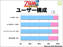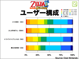 これまで男性ユーザー圧倒的優位だったゼルダシリーズの中で、DSゼルダは女性登録比率が高くなりました。クラブニンテンドーでは、登録データで男性比率が高めに出る傾向がありますので、実際の女性比率はさらに高いものと考えられます。特に、女性の中でも10代後半から30代前半にかけての女性のお客様が多く、また、会員様の中には、『New マリオ』や『どうぶつの森』で始めてDSを触り、そして今回初めてゼルダシリーズを遊ばれている方が多いこともわかっています。 そして、この取り組みは、ゲーム初心者にご満足いただいただけでなく、タッチペン操作に不安を持っておられたゲーム熟練者のみなさんにも最終的には納得していただけたのではないかと感じています。