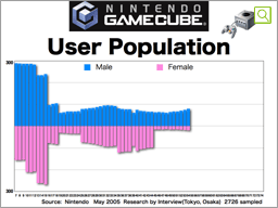 Now, when we look at home console hardware, this chart shows the ages and genders of our customers for NINTENDO GAMECUBE about 2 and half years ago. We have altered the scaling of the vertical line a bit from the previous graphs. Once again, you can see that core users exist in younger age groups. As a result, Nintendo platforms in the days of GAMECUBE and Game Boy Advance were said to be for children.