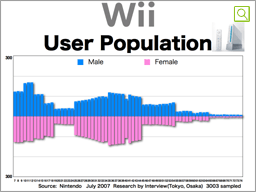 In July this year, Wii users looked like this. The Wii's installed base was just around 3 million then, but Wii was already accepted by people in many age demographics, more so than the days of GAMECUBE, and its core users were not confined to the very young. As with DS, the share of female users was more than 50%, or 51% to be more exact.
