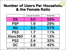 One other thing we are researching is how many people are using game hardware within a household. In other words, we are looking at the "User Number per Household" for each machine. Here, DS and Wii show a substantial change. In the past, the number of users per household was 2.2 to 2.8 for a home console machine, and around 2.0 for a portable machine. But now, Wii has an average of 3.5 users and DS has 3.0 users, both of which are record highs in the history of video games. And given the fact that this sample includes a number of households with only one resident, we can understand that, in many other households, all members of the family are playing with DS and Wii This has a significant correlation with the high ratio of female users. The fact that female users in a wide range of age demographics have supported Nintendo platforms has greatly contributed to expanding the gaming population and, thus, helped lead to the rejuvenation of the game market.
