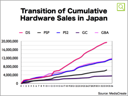 This graph shows the transition in cumulative hardware sales dating from their launches. As you can see, DS, beginning with its 2nd year on the market, has been constantly showing an overwhelming sales rate that typically can be found on other platforms only during the year-end sales season. DS has been selling virtually irrespective of seasonality, with record speed that no other machine in the past could match. We can look at this aspect from the perspective of user expansion. When we launched DS, it was typical that potential customers asked someone in the family to purchase DS for them as a gift, during a sales season or around the turn of the year, or school vacation times in spring and summer. However, with the shift of DS core users from lower-aged groups alone to much wider and older demographics, those who want to purchase a DS can now afford to buy it for themselves whenever they feel like doing so. Also, the growing number of users in a household means that more and more people in families now think DS is something relevant to them. To put it another way, fewer and fewer people oppose the idea of purchasing a game machine. These two things have brought about this big change, we believe.